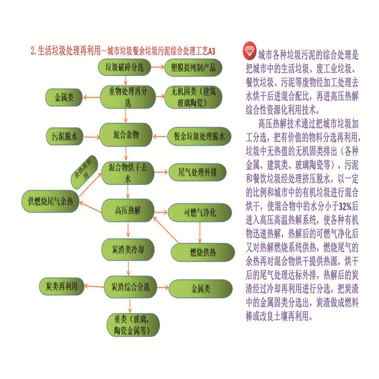 城市里各種垃圾污泥綜合處理是把城市中的生活垃圾、廢工業(yè)垃圾、餐飲垃圾、污泥等廢物經(jīng)加工處理去水烘干后進混合配比,再進高壓熱解綜合性資源化利技術(shù)。